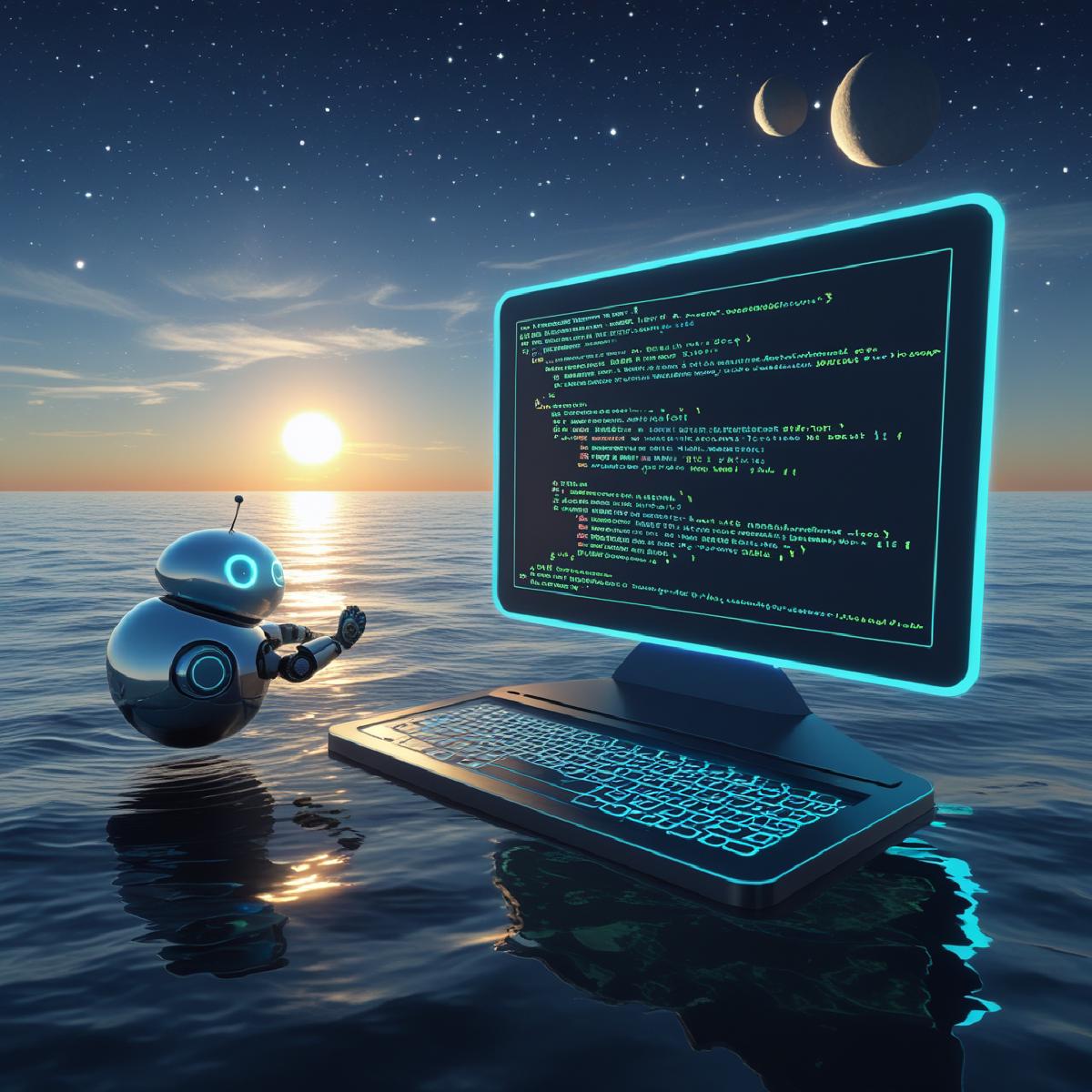 Prompt: A small round-shaped shiny bot floating on an endless ocean, seemingly working by typing on holographic keyboard while staring at large holographic projected screen in the air. This screen is showing a lot of source code. Beyond the endless horizon is rising sun, while stars above harbor two different size moons also.